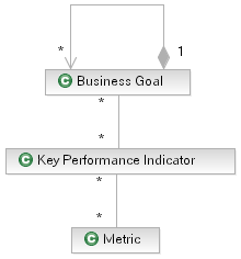As described in the Guideline: Business Goal the relationship between Business Goals, KPIs and Metrics can be seen in the following diagram.
