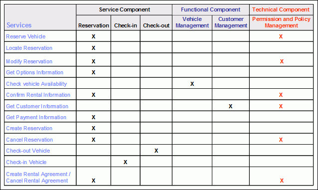 Alternatively you can use a tabular format in expressing the required components and their relationship to the services previously identified, as shown in the figure below.