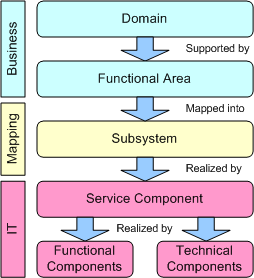 Subsystems, in and of themselves, are not IT assets and not deployable into the IT infrastructure; they provide a bridge between the business and IT perspectives. Each subsystem is realized by one or more Service Components where a Service Component is an enterprise-scale asset (a managed software element with guaranteed availability, load balancing, security, performance, and versioning). The Service Component is in turn realized by multiple Functional and Technical Components according to the diagram below.