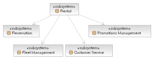 The resulting UML model of the subsystems identified above would be the following, note that the subsystem dependencies are already provided in the model shown below.