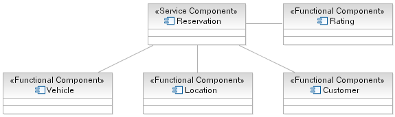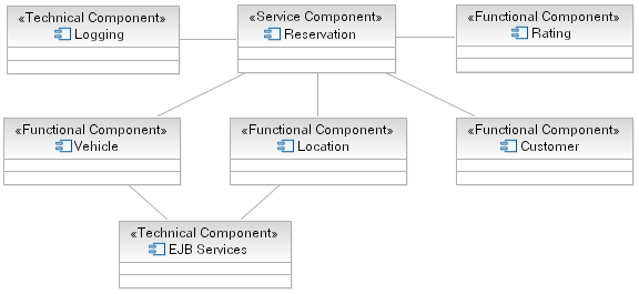 In completing the Rent-a-Car component model (see functional component step above) we include two technical components into the model, one for the Reservation to log the completion of a reservation request and one to denote that the Vehicle and Location components rely on EJB Services to persist their business data.
